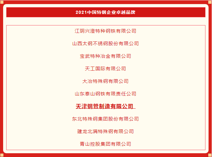 “2021年中国钢铁行业品牌榜”于近日发布,天津钢管制造有限公司荣获“2021中国特钢企业卓越品牌”。