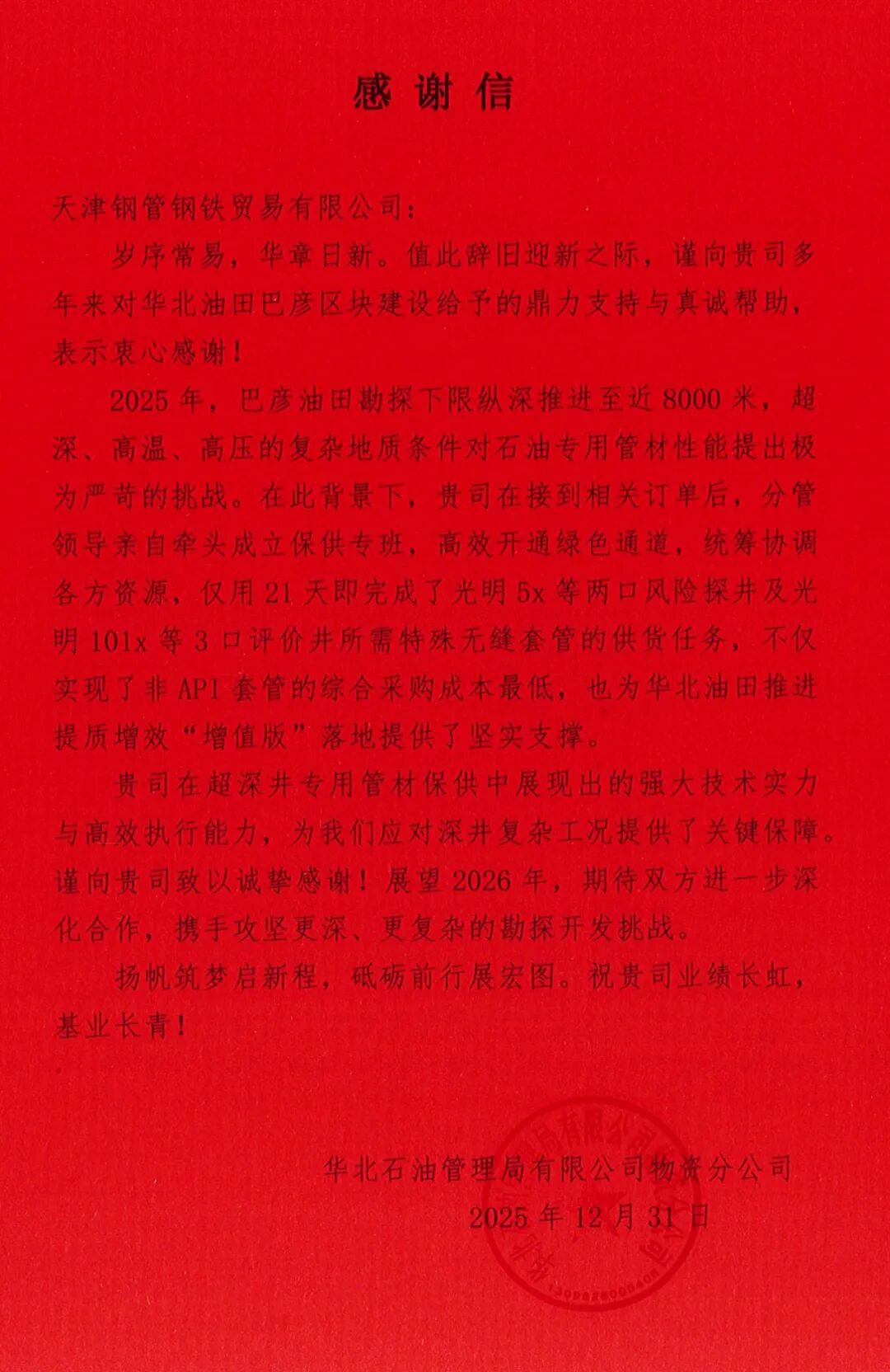 2025年12月31日,中国石油华北油田公司发来感谢信,对天津钢管克服重重困难,保质保量如期交付高品质TP系列特殊扣套管,有效解决了该公司重点项目急需一批特殊型号无缝套管的燃眉之急,给予充分肯定和高度赞扬。