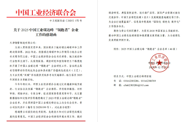 近日,中国工业经济联合会第四届中国工业碳达峰论坛在山东青岛举行,天津钢管荣获中国工业碳达峰“领跑者”企业,这一荣誉不仅是对企业绿色发展成果的权威认可,更凸显出其在长流程钢铁行业低碳转型进程中的标杆引领价值。