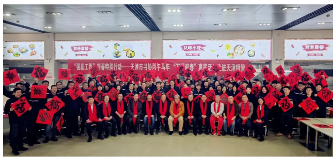 2026年2月5日,为深入学习践行习近平新时代中国特色社会主义思想和党的二十届四中全会精神,精准落实“以文化人、以文惠民、以文润城、以文兴业”文化使命,积极响应中国书法家协会与天津市书法家协会号召,天津钢管携手天津书协共同举办“强基工程”新春特别行动——天津市书协丙午马年“万福迎春”文化惠工活动。公司常务副总经理温德松出席活动并致欢迎辞,天津书协驻会副主席兼秘书长杨健君代表书协一行向公司职工致以新春祝福和亲切问候。